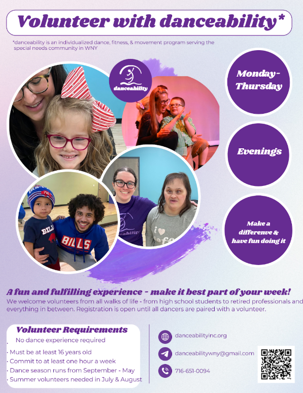 If you are interested in volunteering at danceability please give us a call at 716-651-0094 or email us at danceabilitywny@gmail.com.